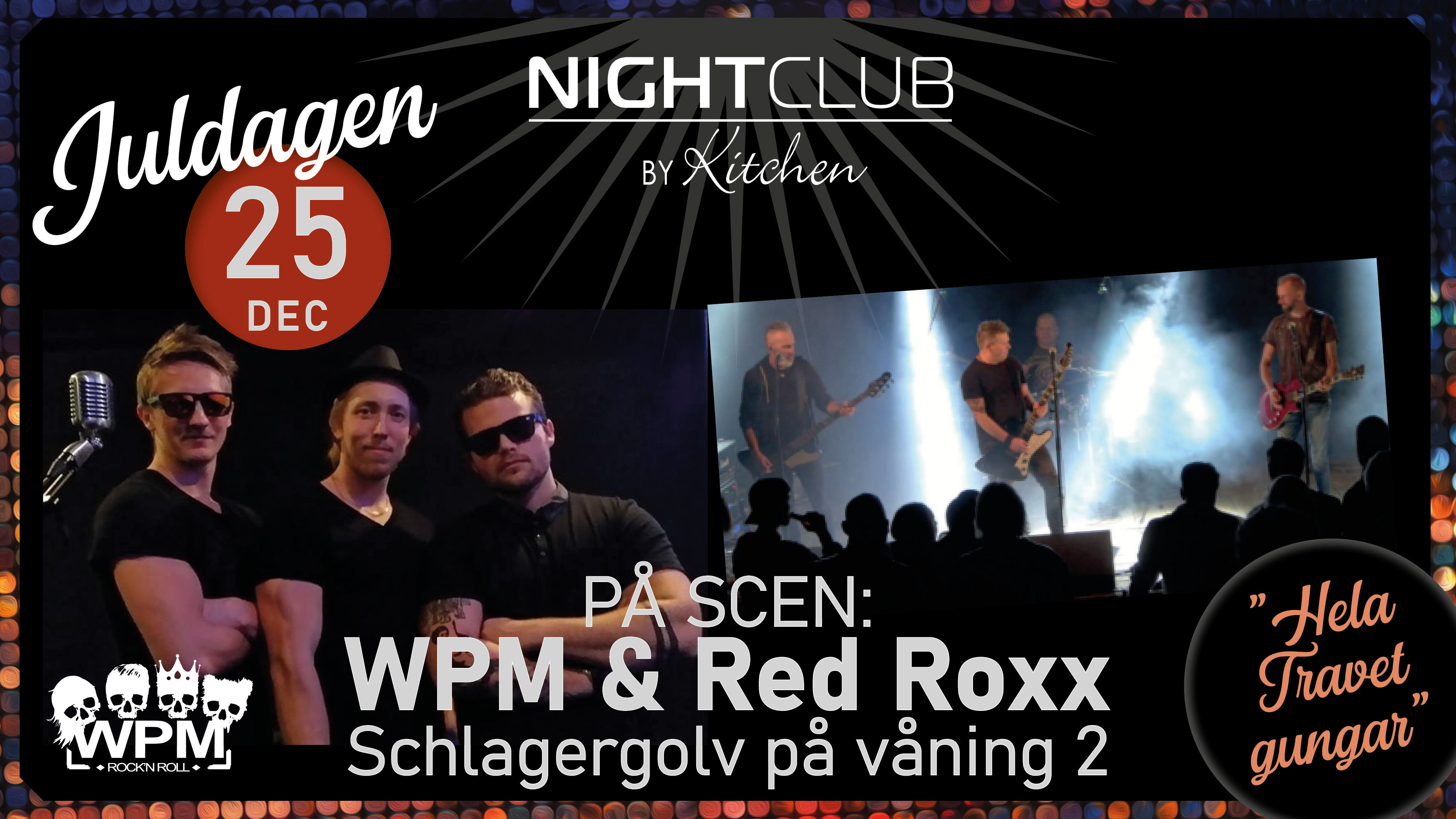 Vi kör dubbla dansgolv hela kvällen. DJ både uppe och nere, på vån. 2 spelar vi schlager natten lång och på nedre plan rullar det schön musik som vanligt! WPM och Red Roxx uppträder.